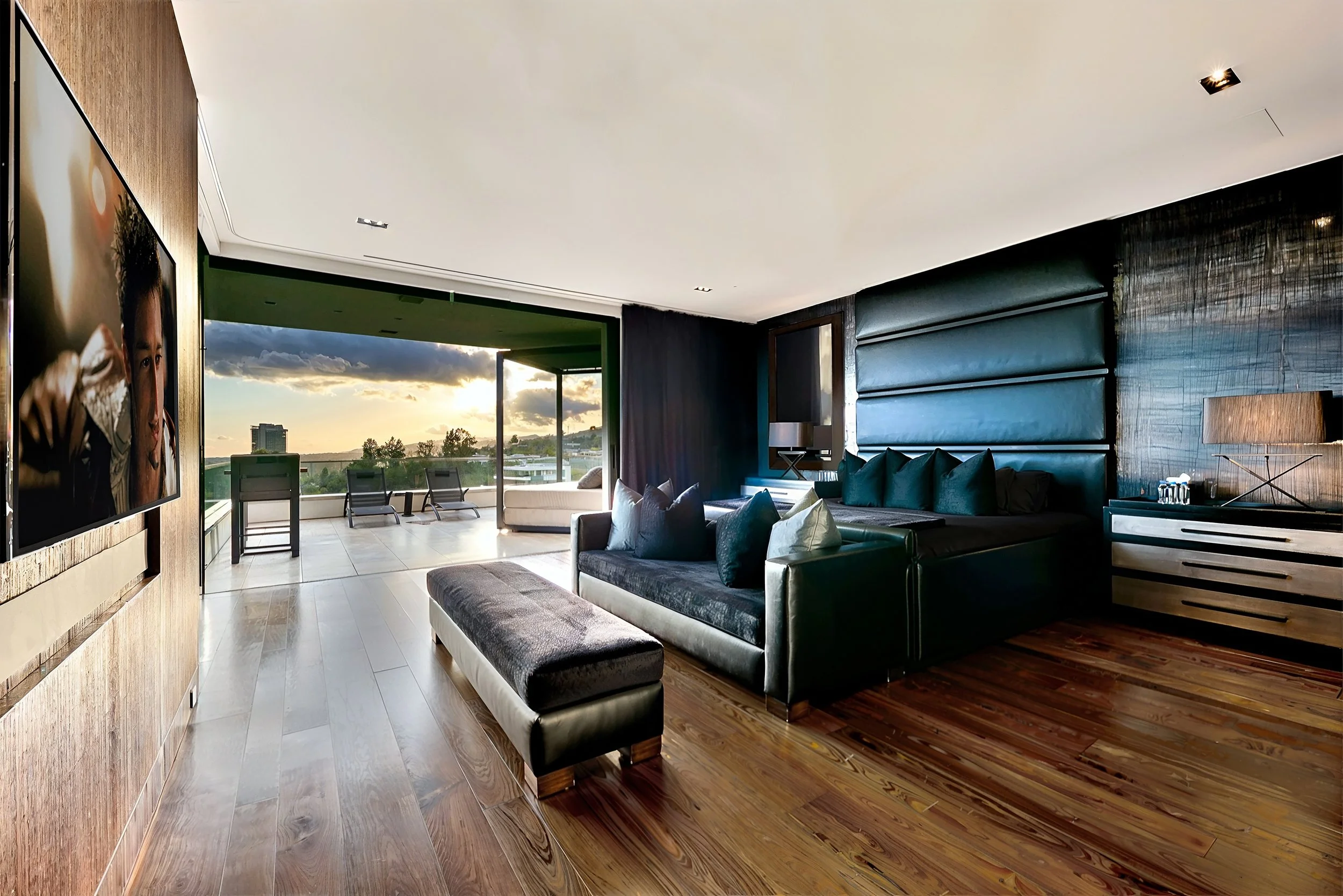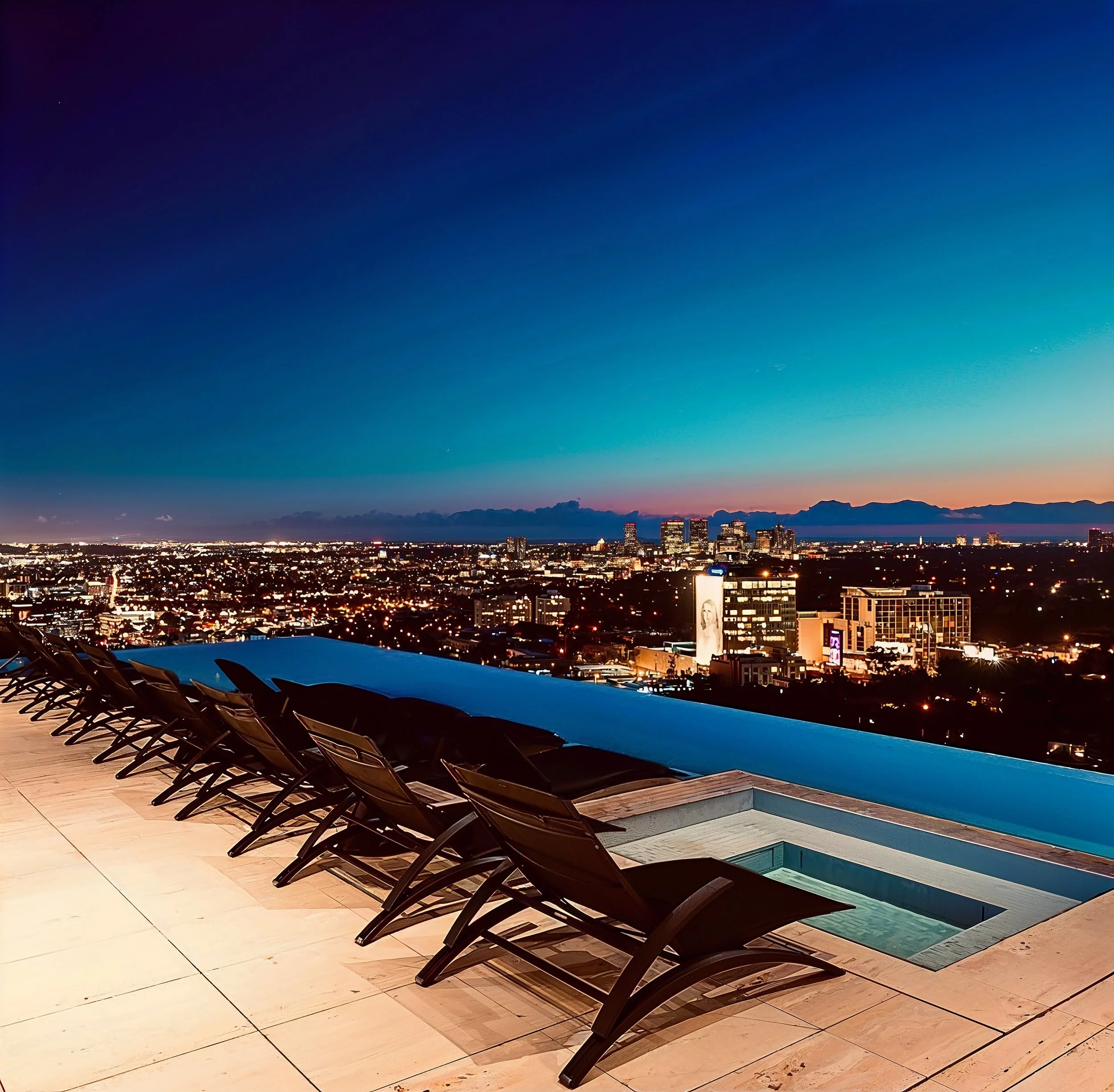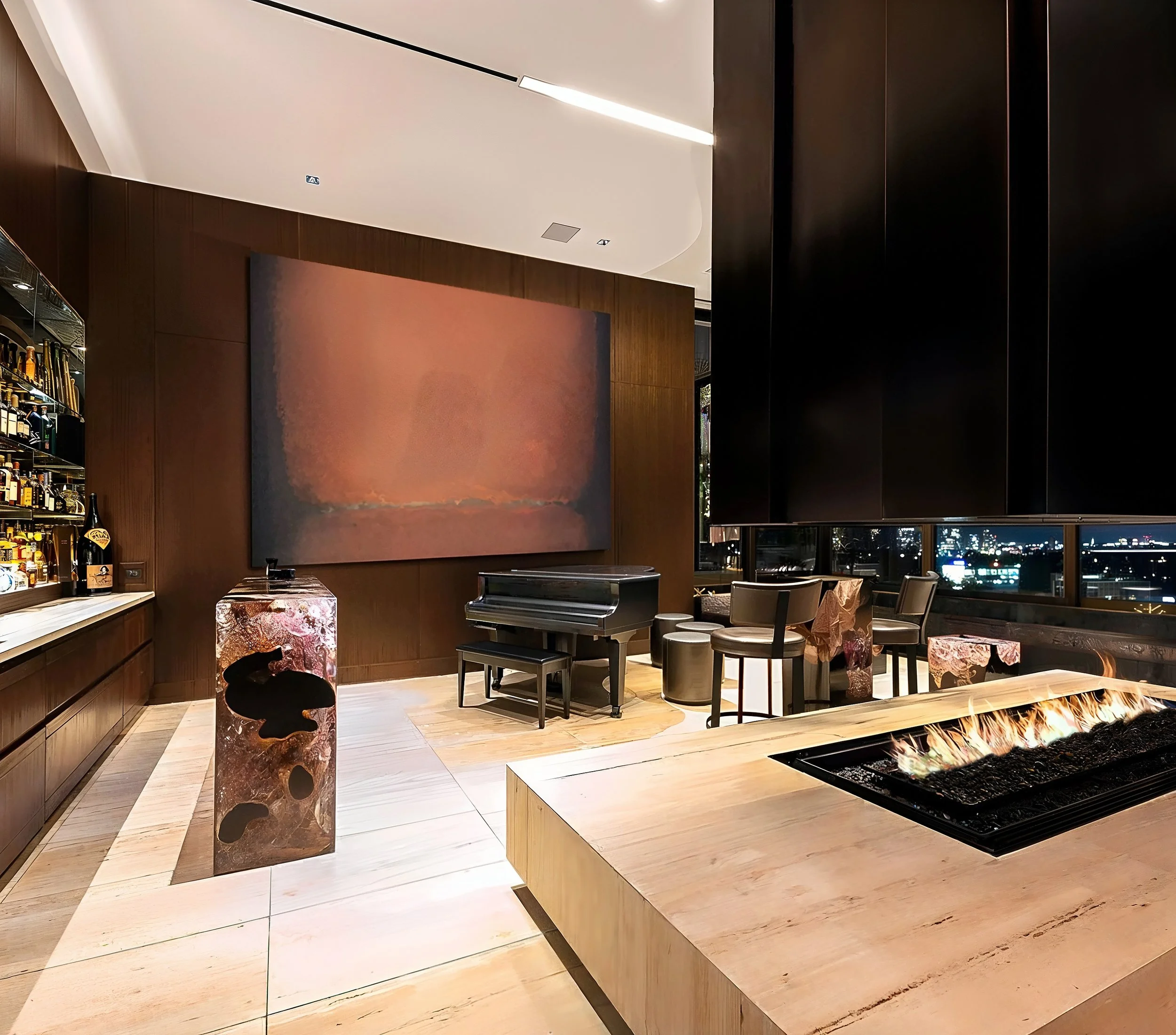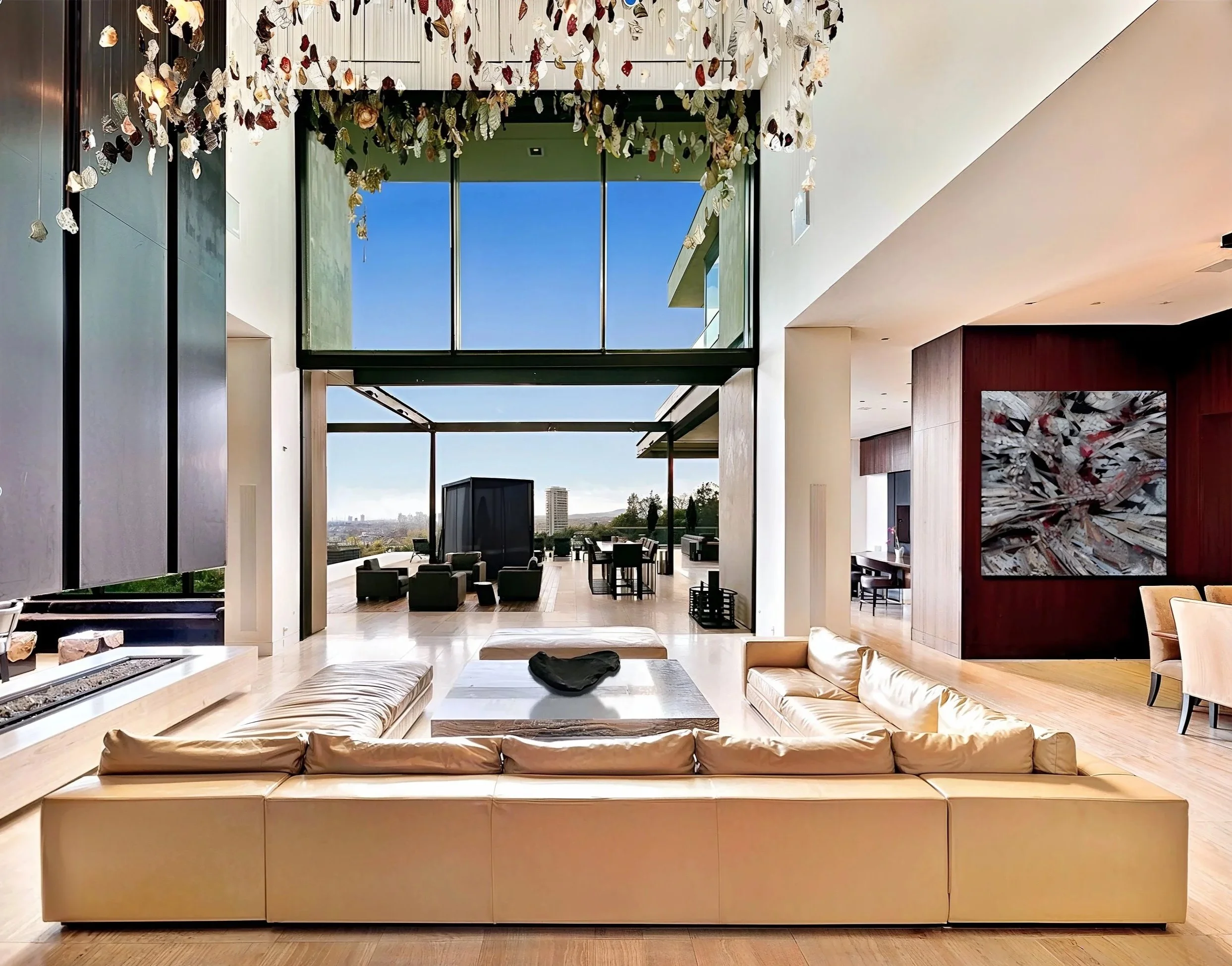 Perched high in the Hollywood Hills, this residence is the ultimate bachelor pad—designed for a high-flying businessman who wanted a home that embodies both power and indulgence. The interiors are unapologetically masculine, defined by strong architectural lines, rich materials, and bold focal points. Double-height ceilings with doors that open across two floors create a dramatic inside–outside connection, framing sweeping views over Los Angeles. At its core, the fireplace anchors the living space as a commanding focal point, while the infinity pool spills over the cliff edge for an unforgettable effect. Every element was conceived for entertainment and relaxation alike—seamlessly blending party house energy with spa-inspired calm. This is Hollywood Hills living at its most sophisticated and indulgent.
